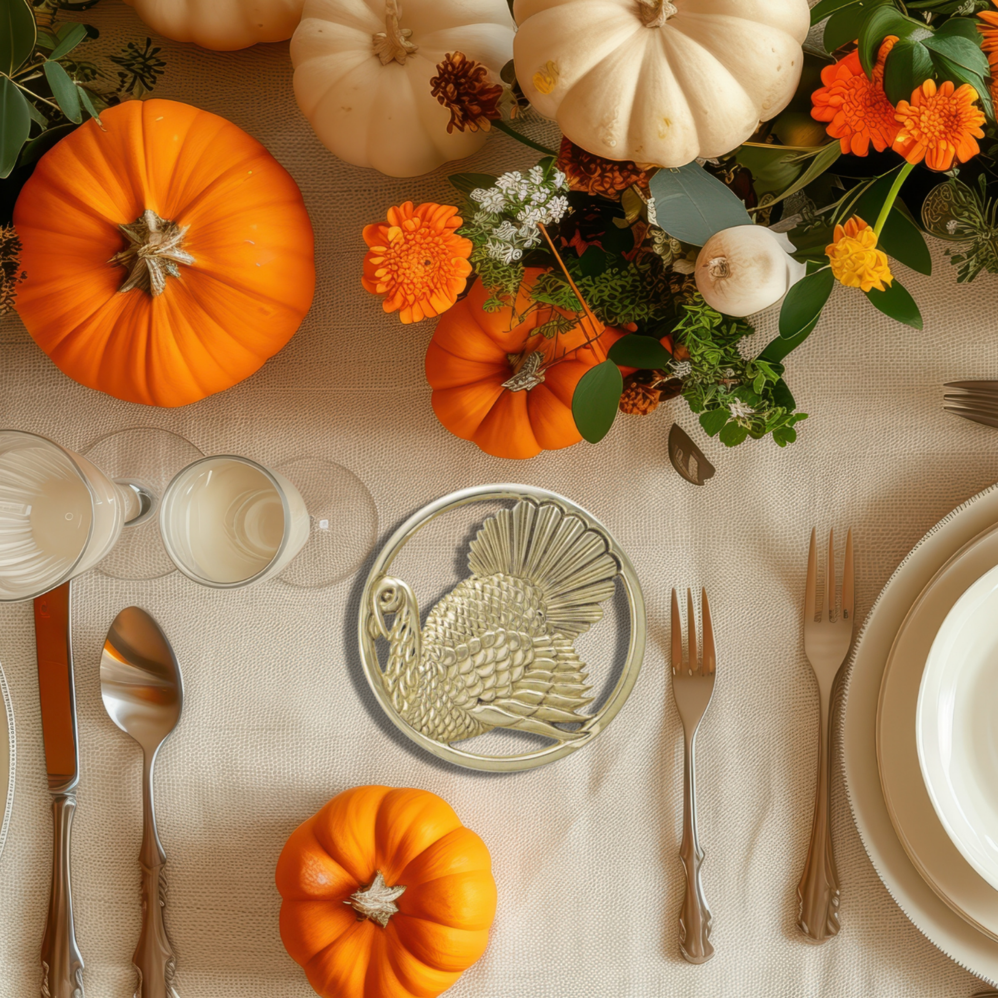 A special addition to your Thanksgiving traditional dining table should be our festive brass turkey trivet. Hand cast in solid brass to the highest standards of quality and craftsmanship, and polished to perfection. Protect your Thanksgiving dining tables and sideboards from heat and stains with the Jefferson Brass Thanksgiving turkey trivet. Sure to be a family favorite at the Thanksgiving table. This piece can also be used as a wall decoration. We have added a small hanger to the back of the trivet to make it the most versatile and charming Thanksgiving accessory. Â
