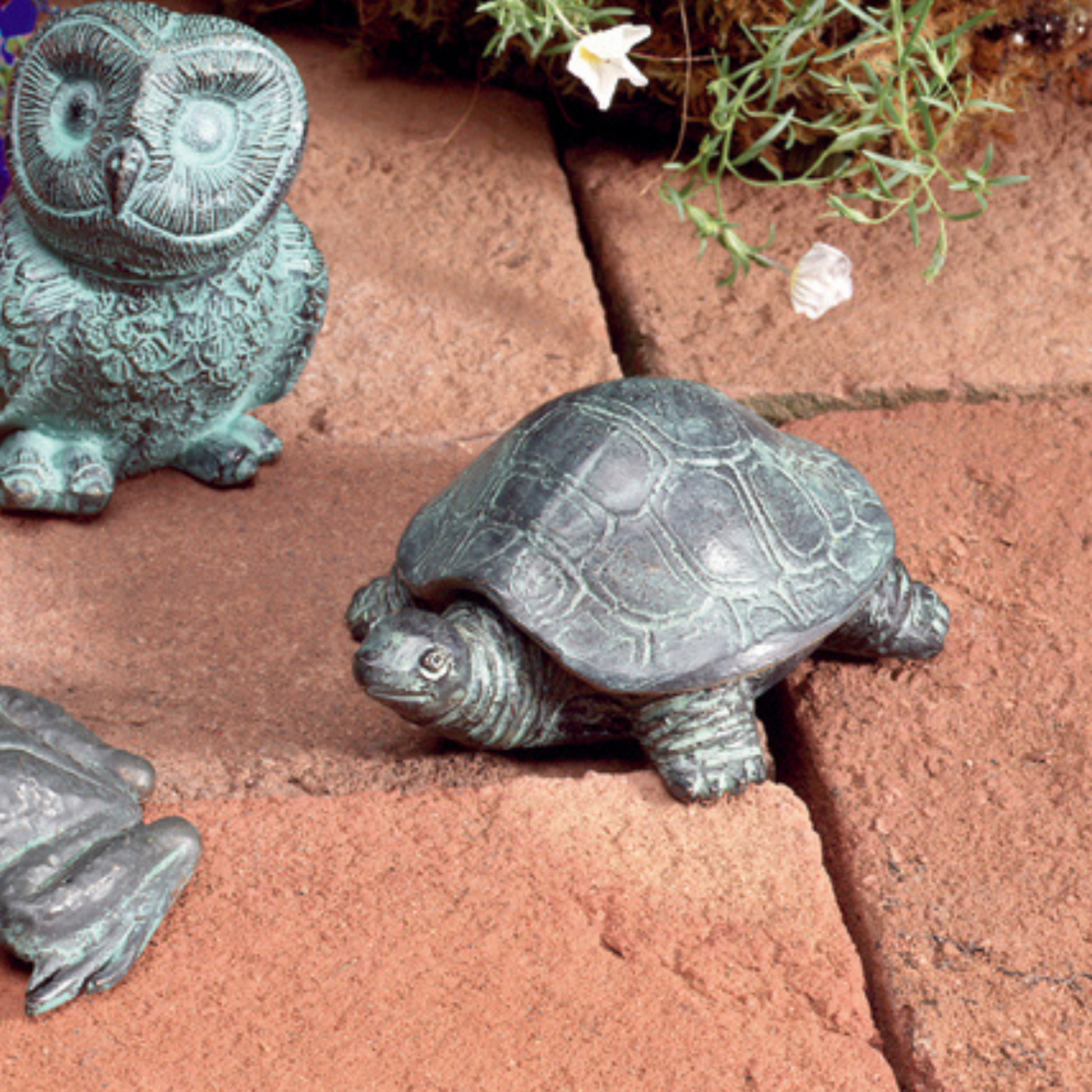 Adorable brass garden turtle. This classic decorative work of art is hand cast in solid brass with a verdigris patina that will age with beauty. Outdoor garden accessory or indoor home decor. Solid brass turtle. Timeless in material and artistically exquisite in their simplicity, these original brass garden animals statues sculptures feature some of America's favorite critters. They provide a very special spirit and accent to any garden, tabletop, desk, or library. Their life-like charm and grace celebrate Nature's spirit and is a welcome addition to any decor. These classic and decorative works of art are hand cast in solid brass and preserved with verdigris patina. The finish is naturally weatherproof, and the brass turtle will age with beauty.
