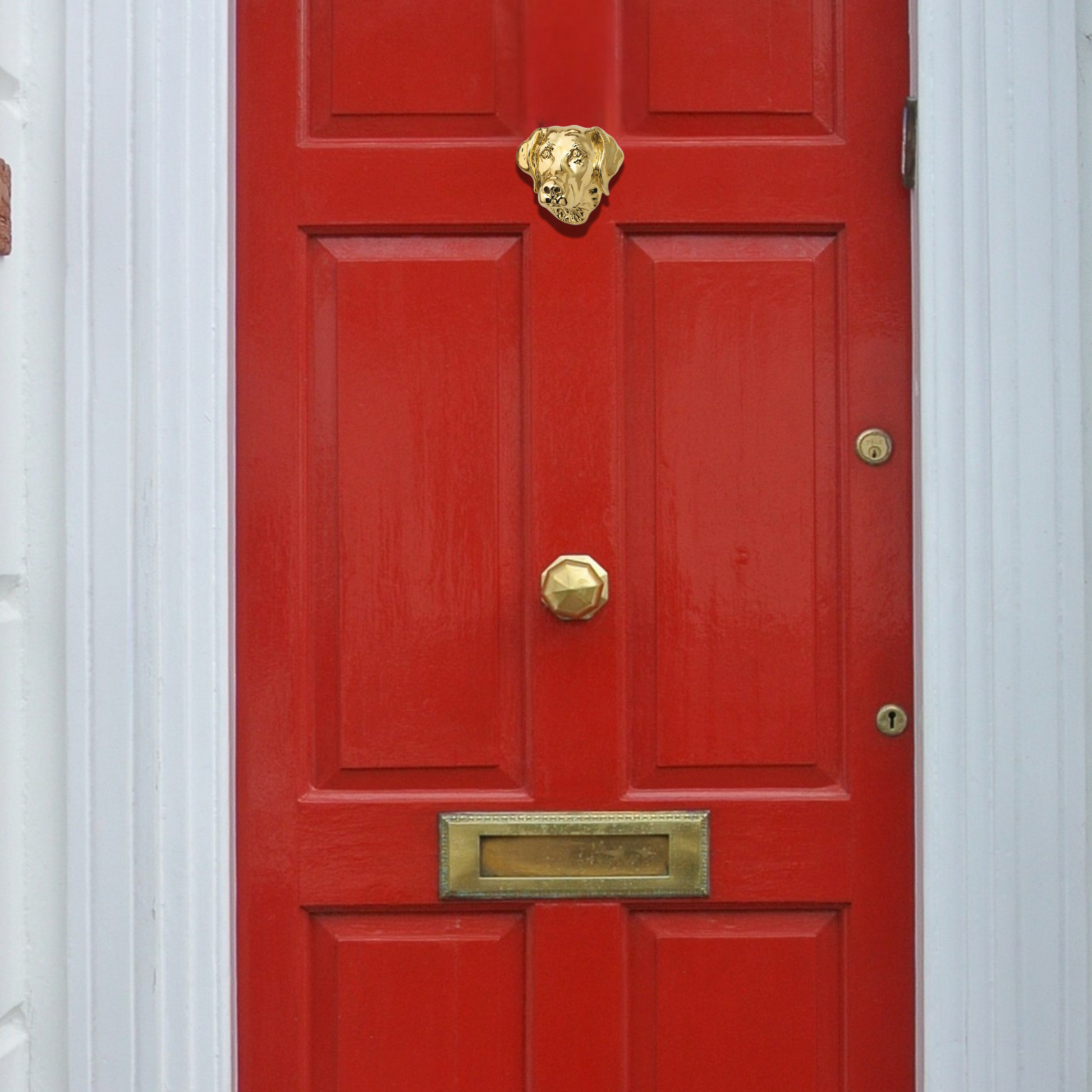 One of America's best family pets, the Labrador Retriever is well known not only for its gentle and loving disposition, but its skill and talent as a hunting dog. Our lab door knocker sculpture is made of solid brass and was inspired by the great goose hunting yellow lab. Known for its quality, our Labrador Retriever dog door knocker is hand cast in solid brass with the finest craftsmanship. The precise detail is almost lifelike, making it an excellent example of handcrafted animal art. A sophisticated and charming door knocker.