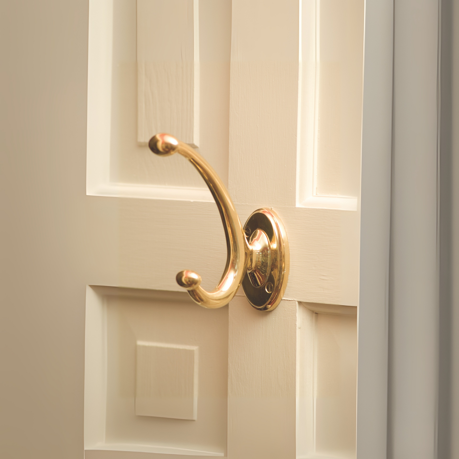 The Great American Coat Hook! This large brass coat hook may be the most handsome and elegant coat hook ever designed. The profile of line and shape elevates a simple utilitarian hook into a piece of art. Both arms have elliptical protective "comforters" at their points, specially designed to prevent stretch marks and damage to your garments. A priceless object of Americana, this solid brass hook is an unsurpassed example of functional art. Hand cast in solid brass to the highest standards of quality and craftsmanship, the large brass coat hook elevates the form and function of the door to which it is attached.