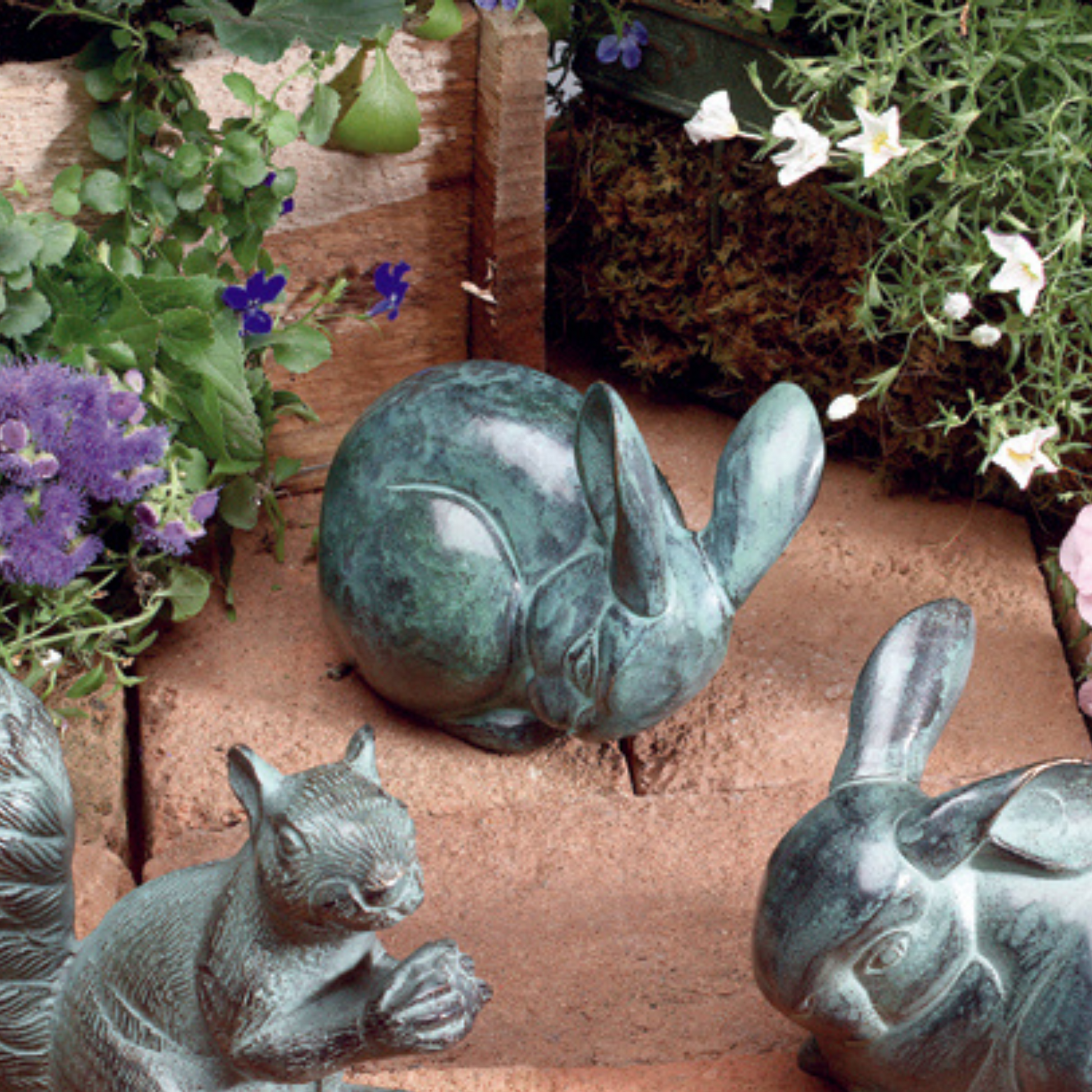 Hand cast in solid brass with a verdigris finish is the Rabbit Garden Accent. This classic decorative work of art is hand cast in solid brass with a verdigris patina that will age with beauty. Outdoor garden accessory or indoor home decor. Solid Brass. Timeless in material and artistically exquisite in their simplicity, these original brass garden animals statues sculptures feature some of America's favorite critters. They provide a very special spirit and accent to any garden, tabletop, desk, or library. Their life-like charm and grace celebrate Nature's spirit and is a welcome addition to any decor.Â