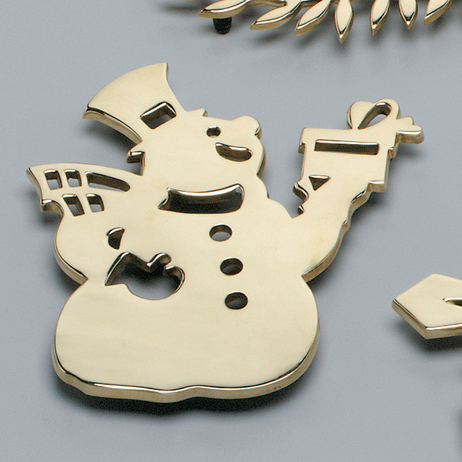 A stylized version of a snowman with top hat and gift, this whimsical snowman trivet brings the symbol of a winter wonderland to your home! Hand cast in solid brass the snowman trivet spreads Christmas cheer! Expertly made to protect your tables and sideboards from stains and heat, this trivet can also be used as elegant accent pieces around your home. Capture the magic of Christmas with this festive solid brass snowman trivet! Each Jefferson Brass Christmas trivet is created with the very spirit and wonder of Christmas in mind and designed to be treasured as family heirlooms to last generations. Our brass snowman trivet is available in polished brass finish.