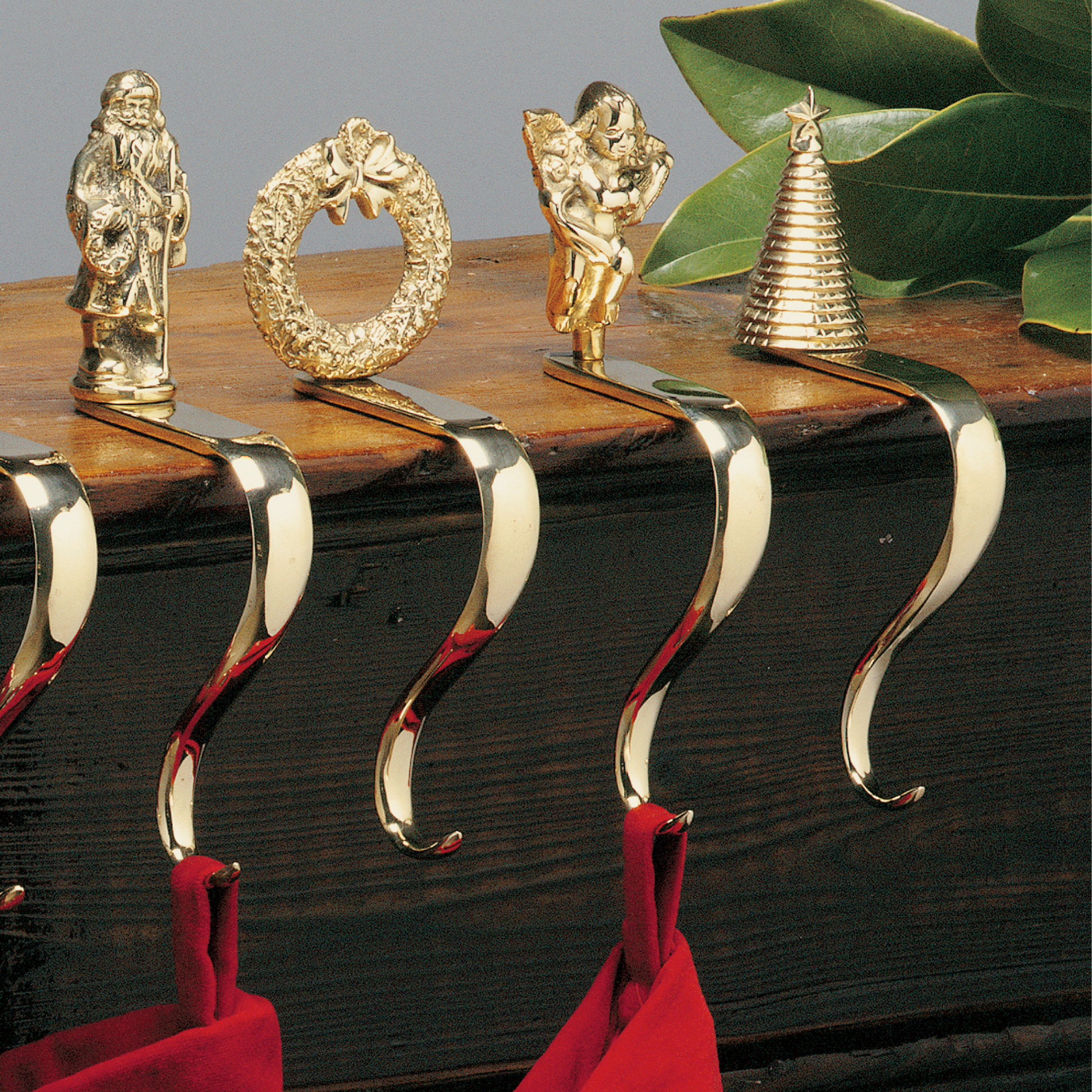 Solid brass Wreath Christmas Stocking Holder. Exclusively from Jefferson Brass Company, this stocking hanger is cleverly engineered and will support any amount of weight without leaving unsightly nail holes or marring the mantel top. IMPORTANT NOTE: For mantel ledges more than 2" thick, please call our office at 703-821-8222 between 9:00 am and 5:00 pm EST for options. Measures 3" high. Weighs 0.66 lbs.